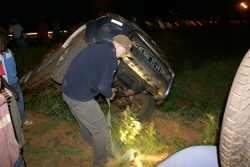 Met hen zelf was gelukkig niets aan de hand, alleen geschrokken en toen uit de auto geklommen. Maar hoe krijg je je auto hier weer uit? Een bevriende zendeling opgetrommeld met een 4×4 auto en vervolgens met planken, krikken en schoppen aan de slag. De eerste poging om gewoon direct te trekken mislukte. Het bleek dat de greppel echt veel dieper was dan dat iedereen had gedacht en kon zien. Bij nadere inspectie bleek alles los gras te zijn en losse grond waar de auto alleen maar in wegzonk. Dus toen, onder constant commentaar van 100 omstanders, aan de slag met planken en krikken. Na in totaal twee uur ploeteren en knutselen was het tijd voor een poging. En jawel, in één keer kwam de wagen uit de greppel. Het linkerachterlicht was kapot en een ingedeukt paneel aan de achterkant was verder de enige schade.