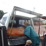 Wij zijn enorm actief geweest en Piet heeft heel veel kunnen betekenen voor Frank en Sandra, maar zeker ook voor het trainingscentrum. Lassen,timmeren, graven, goochelen, alarminstallatie aansluiten, brandkast onzichtbaar inbouwen. Als zijn vrouw heb ik enorme waardering voor Piet gekregen; de energie die het allemaal heeft gekost; geweldig dat hij die heeft! Maar wat heb ik dan allemaal gedaan? Afwassen, piepers schillen, oppassen, de was op hangen, verven, kasten opruimen, kletsen bijpraten als moeder, w.c.’s schoonmaken en als klap op de vuurpijl, jawel, bij een heuse verhuizing geholpen. Wat ben ik blij dat ik dit heb mogen meemaken, je kijkt je ogen uit. Wij Nederlanders hebben een verhuiswagen nodig of zelfs een container om van het ene huis naar het andere te verhuizen, maar hier ging het allemaal achter in de witte truck (single cap) van Frank en Sandra. Collega’s moesten van het trainingscentrum naar een ander huis verhuizen om ruimte te maken voor de studenten van de DTS (Discipelschaps Trainings School) die volgende maand van start gaat. Gister, na een lange tijd van regen moesten we maar onze regenkleren aantrekken en rijden maar. Daar aangekomen bleek de vrouw des huizes rustig haar schamele bezittingen in kranten te wikkelen. Alleen een paar koffers stonden klaar, het matras moesten we inpakken in plastic en zo de truck indragen. Twee ”tafeltjes”, een paar boeken, drie puzzeltjes en een paar verhuisdozen met wat pannen en kleren en vertrekken maar. De verhuisdozen waren zelfs nog van Frank en Sandra.