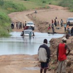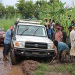 We schoten redelijk op de eerste dag want in Nampula is er nog asfalt maar toen begonnen de modderpaden. Victor zat vast in de blubber terwijl hij twee vrachtwagens wilde passeren die gebroederlijk naast elkaar vast zaten in de modder. En toen kwam hij vast te zitten dus dat werd een klein uurtje duwen en trekken en toen was hij er door. Dus ik zet vrolijk mijn auto in four wheel drive en scheur er in één keer langs. Alleen nog even de auto weer uit zijn four wheel drive halen (dat is zeg maar de tractor-stand). Dat is soms even pielen met een beetje vooruit en een beetje achteruit maar ik kreeg verschrikkelijk krakende geluiden uit mijn versnellingsbak. Da’s niet goed! Ik kreeg hem niet meer goed in en ook niet meer goed uit zijn four wheel drive maar ja we zitten 40 km weg van het eerst volgende kleine dorpje dus je moet wat. Proberen, proberen, bevriende monteurs bellen maar uiteindelijk moest Victor me slepen. Normaal gesproken prima te doen maar nu met een lekker korte trekkabel in het donker over onbekende smalle modderpaden best bijzonder. Weer eens een echt avontuur kan ik je vertellen. Uiteindelijk aangekomen in Mutuali waar we een monteur vonden die op aanwijzing van onze huismonteur een aandrijfstang probeerde los te koppelen maar helaas het resultaat was dat het niets hielp. Dus een slaapplek gevonden in een lokaal ‘bed and breakfast’ (alleen dan zonder het ontbijt en met muskietennetten die te klein waren voor het bed) en de volgende ochtend nog een keer 60 km slepen naar Cuamba waar een heuse garage is! Het was in ieder geval bij daglicht dus dat was beter. Ongeveer halverwege deze rit kwamen we bij de rivier Lurio aan en die bleek volledig overstroomd te zijn. Sandra heeft spectaculair foto- en videomateriaal hiervan kunnen verzamelen. Als eerste maar de kat uit de boom gekeken wat de rest doet en het bleek mogelijk te zijn om er doorheen te gaan en dat gaat dan als volgt. Het water komt ongeveer een meter hoog dus het is als eerste slim om je luchtfilter eruit te halen zodat die niet nat wordt en dicht slaat aan de andere kant van de rivier. Dan mag er vervolgens geen water in je uitlaat komen (helemaal niet als je motor draait want dan kan er nog sneller water in komen en ben je klaar met je reis) maar ook niet als je motor uit staat dus die wordt op zijn Afrikaans afgeplakt met een plastic zakje en wat rubber draad. Dan duwt een groep van een man of acht je auto (met je hele gezin erin) door de rivier terwijl er een mannetje voorop loopt om te laten zien waar de brug is zodat je er niet per ongelijk af dondert. Het vieze water kwam zo’n 10 cm onze auto in; het ruikt dan ook nog steeds heel bijzonder in onze auto. Aan de andere kant mag je dan 500 mts betalen (12,5 euro) en dat was het dan….. maar natuurlijk niet als je elektronische beveiliging van je auto onder je stoel is geschroefd en er flinke golven water door je deur heen komen zodat je auto op tilt slaat vanwege de kortsluiting halverwege je natte oversteek! Need I say more? Vanwege de korstsluiting ging onze claxon uit zichzelf aan en dit oorverdovende geluid pas uit toen ik de batterij ontkoppelde. Die moest ontkoppeld blijven voor de rest van de rit dus nu werd het gelukkig toch nog een beetje spannender want ik had geen stuur- en rembekrachtiging meer terwijl ik door Victor heuvel op en heuvel af door de blubber werd getrokken. Maar ook dat hebben we overleefd en we zijn in Cuamba aangekomen. Mijn auto staat nu al drie dagen in de garage en ze zijn er nog steeds niet achter wat er precies mis is afgezien van het feit dat ze zeker weten dat het ‘iets met de versnellingsbak is’ (ja, had ik geloof ik ook al bedacht). Het lastige gaat zijn dat zelfs àls we het probleem vinden het heel erg moeilijk is om nieuwe onderdelen te vinden. Wordt vervolgd…………………….