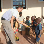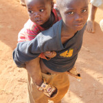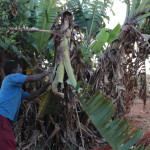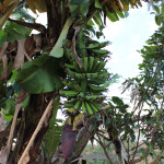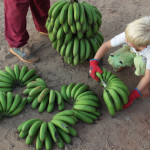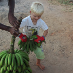 Oftewel: vandaag hadden we een bananenfeestje. Toen Paul, Els en Stephan net aankwamen, begon er één banaan van een hele tros een beetje geel te worden en dus klaar om van de boom af te halen. De afzonderlijke kammen bananen houden we een tijdje in een gesloten zak in de container om te laten rijpen. Vandaag was de dag dat de eersten rijp werden en dus tijd om uit te delen! Judah stapt op zijn fietsje en roept alle kinderen uit het dorp vóór ons huis die er waren – op de foto zie je hem vóór de kliniek: die is nu zelfs al gepleisterd!!! Daarna geven Stephan (die nog ruim 2 weken blijft) en Judah iedereen een banaan. Judah haalt nog even 2 bananen uit de zakken van zijn vriendje die blijkbaar vond dat hij er 3 had verdiend. Nog wat uitgedeeld aan de buurvrouw en aan onze werkers en een voorraadje in de koelkast, zodat Frank ze straks ook kan proeven. Ook op zo’n eenvoudige manier als deze proberen we een zegen te zijn voor de buurt!